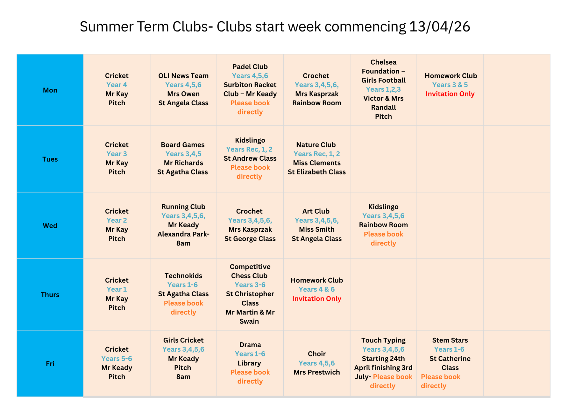 Please book all external clubs directly with them on the posters or links provided.