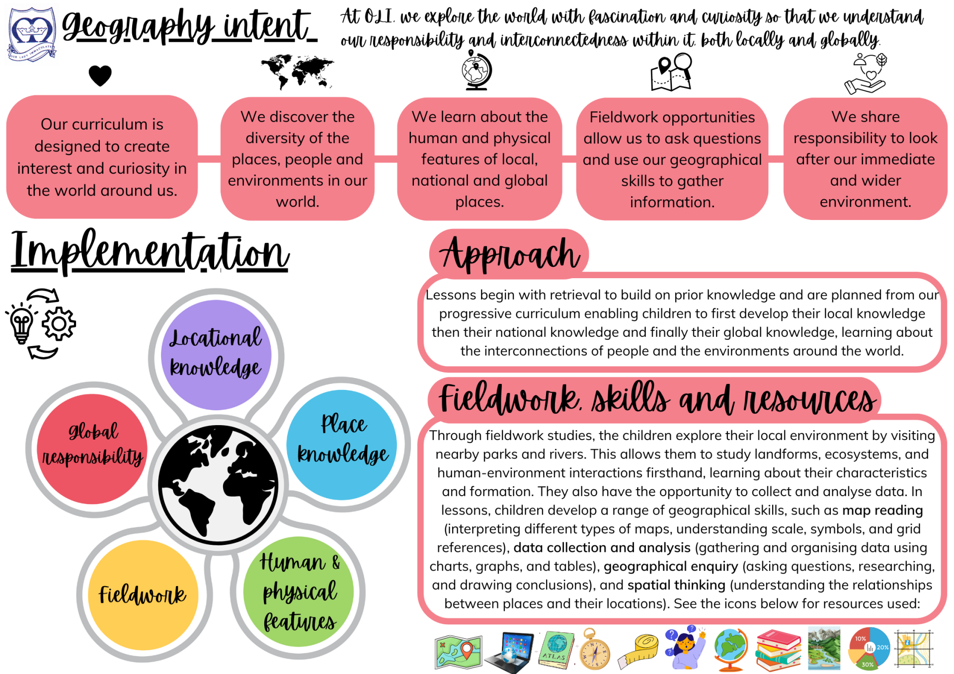 We aim to inspire children’s curiosity and interest to explore the world that we live in and its people, which aims to ignite a love of learning. We intend to equip children with geographical skills to develop their knowledge through studying places, people and natural and human environments. Through our teaching, we intend to provoke thought, and questions and to encourage children to discover answers to their questions through exploration and research to enable them to gain a greater understanding and knowledge of the world and their place in it.