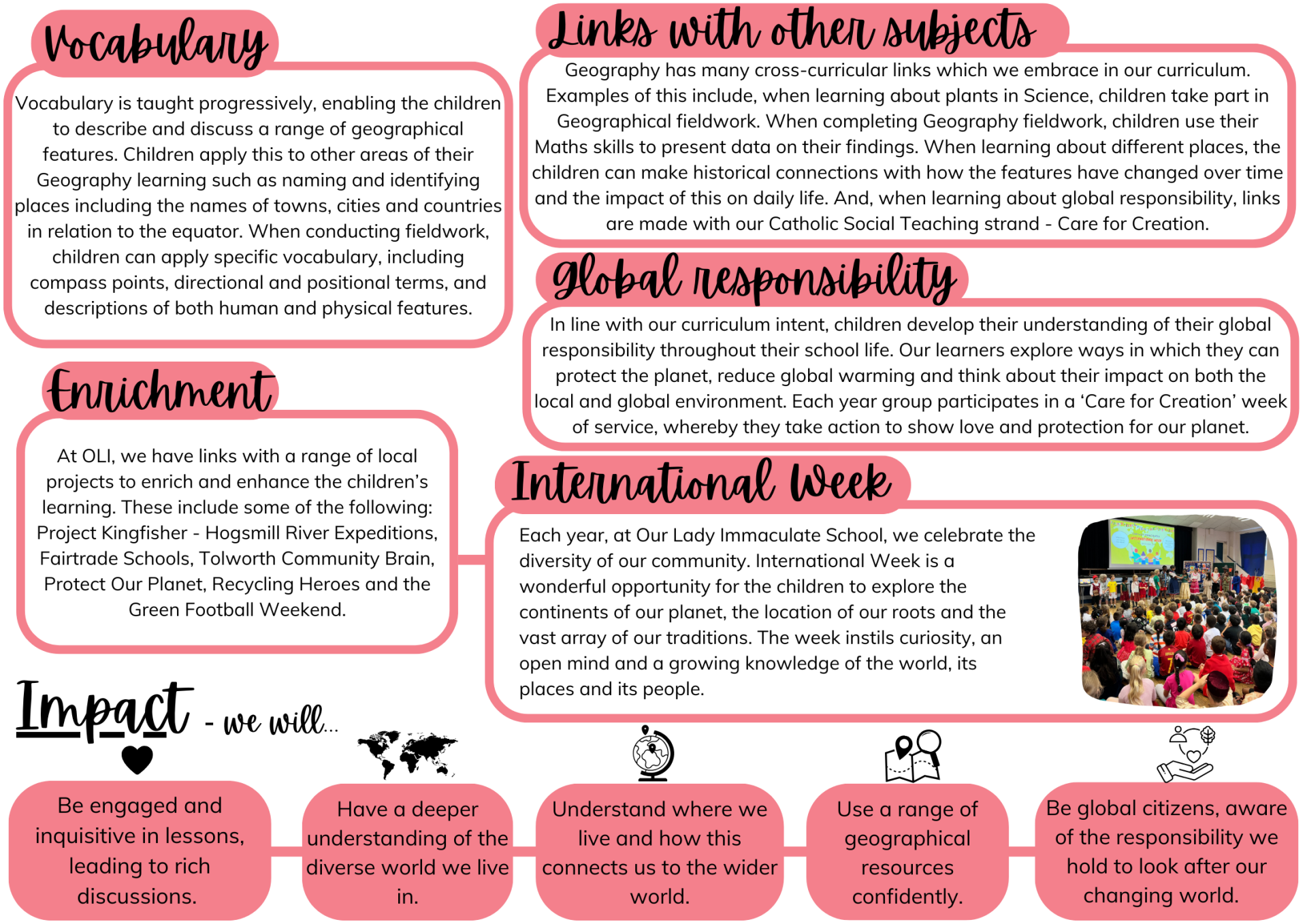 We aim to inspire children’s curiosity and interest to explore the world that we live in and its people, which aims to ignite a love of learning. We intend to equip children with geographical skills to develop their knowledge through studying places, people and natural and human environments. Through our teaching, we intend to provoke thought, and questions and to encourage children to discover answers to their questions through exploration and research to enable them to gain a greater understanding and knowledge of the world and their place in it.