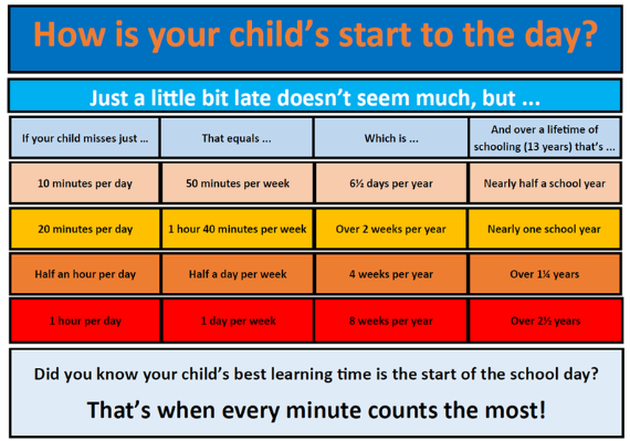 Punctuality is just as important as attendance. Being late to school, even by just a few minutes, disrupts the start of your child’s day and interrupts the learning of others. These minutes quickly mount up into hours of lost education over the school year.