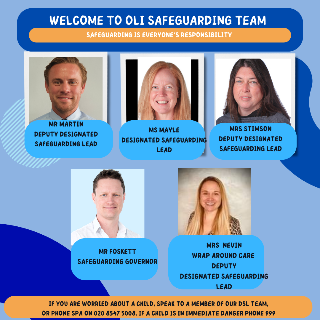 The designated safeguarding leads can be contacted via by the school telephone number 020 8399 9854 (8 am - 4.30 pm) or via email (if the concern is not of immediate danger) at admin@oli.school