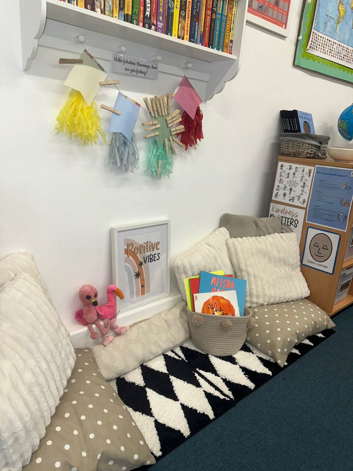 Each classroom has a designated Calm Corner. This is a visible space with cushions or bean bags that the children can choose to use to take a break. This could be to re-regulate their emotions, gather their thoughts or simply continue their learning in a comfortable space.
